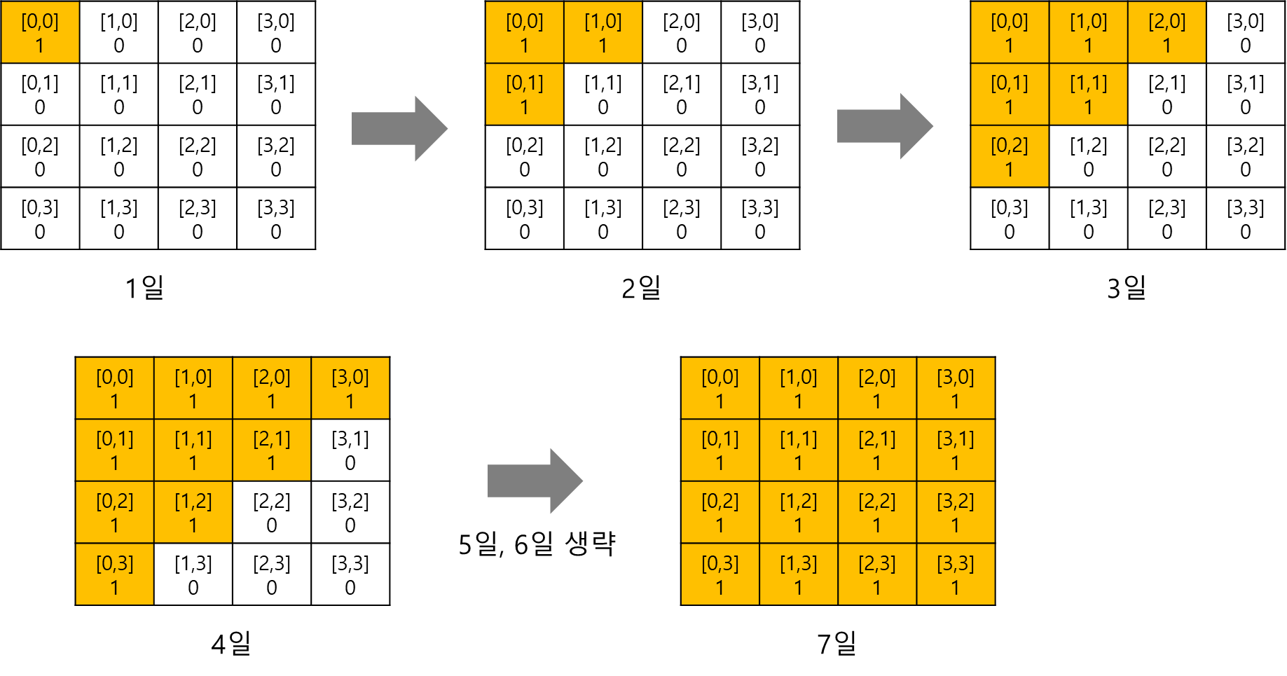 위의 그림에서 1일의 좌측상단에 1로 표시된 곳이 익은 토마토가 있는 곳이고 문제의 설명과 같이 상하좌우로 점점 익으며 7일에 모두 익게 됩니다.