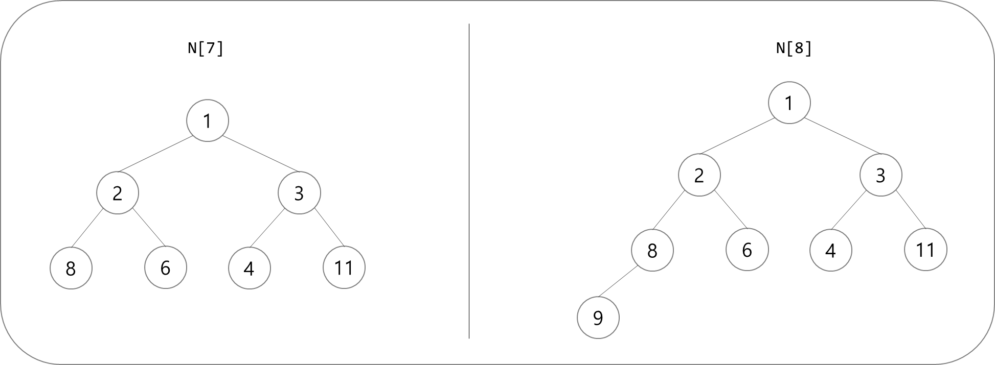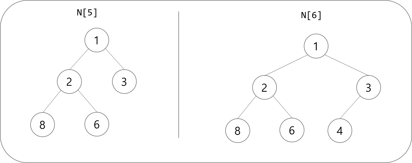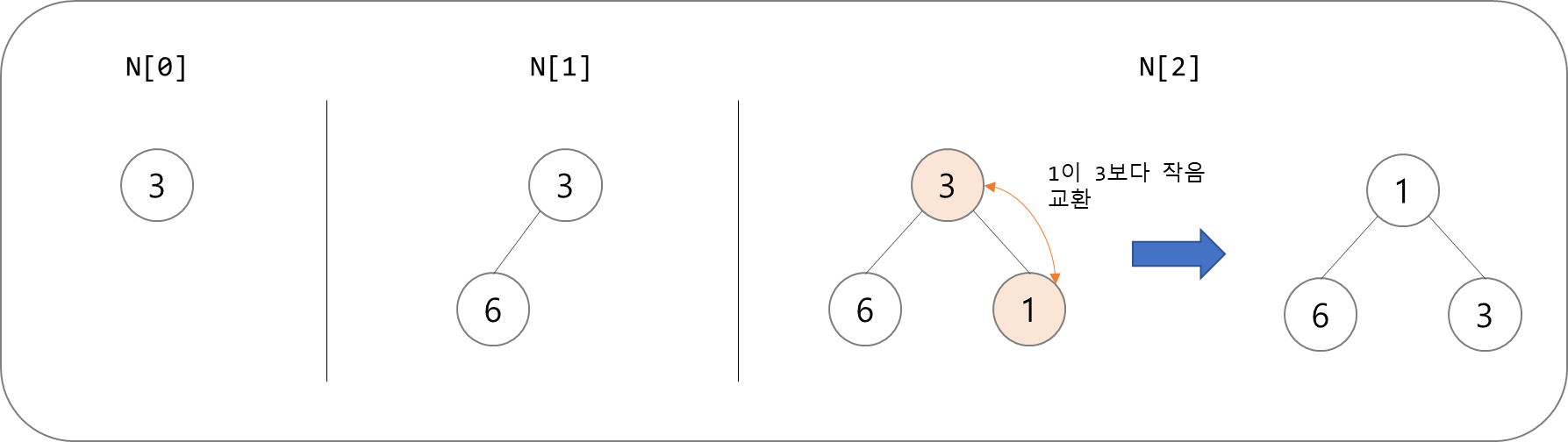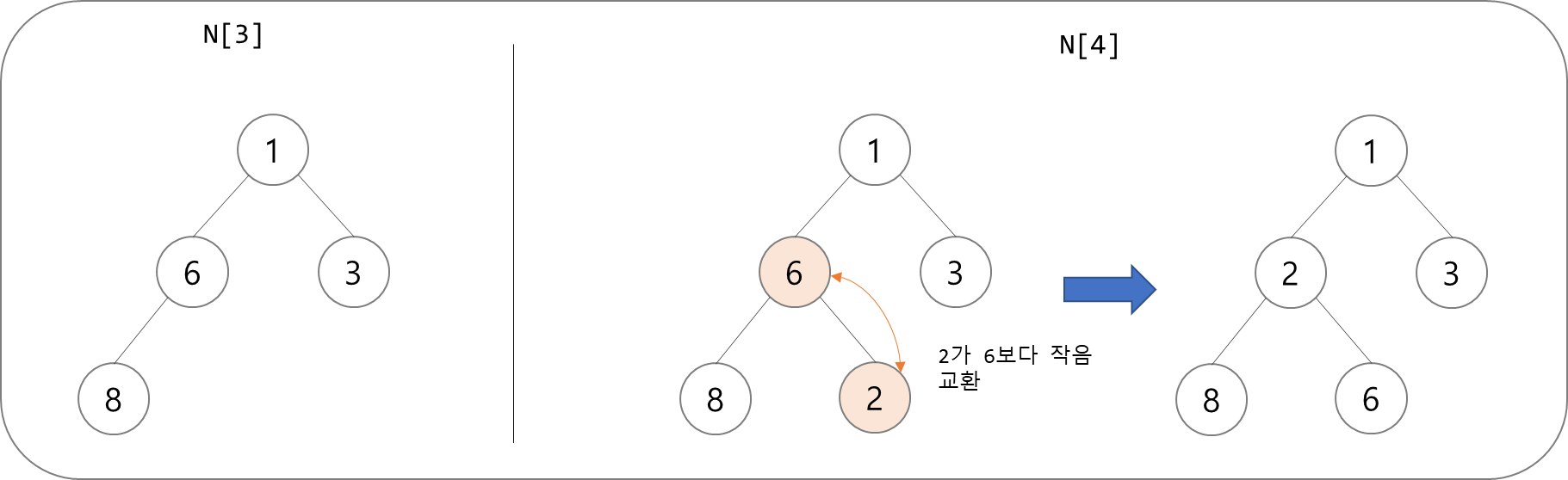 따라서 N[2] 또는 N[4]같은 경우 자식 노드에 추가된 숫자가 부모 노드의 숫자보다 작으므로 교환을 합니다.
