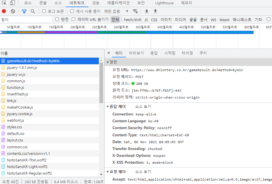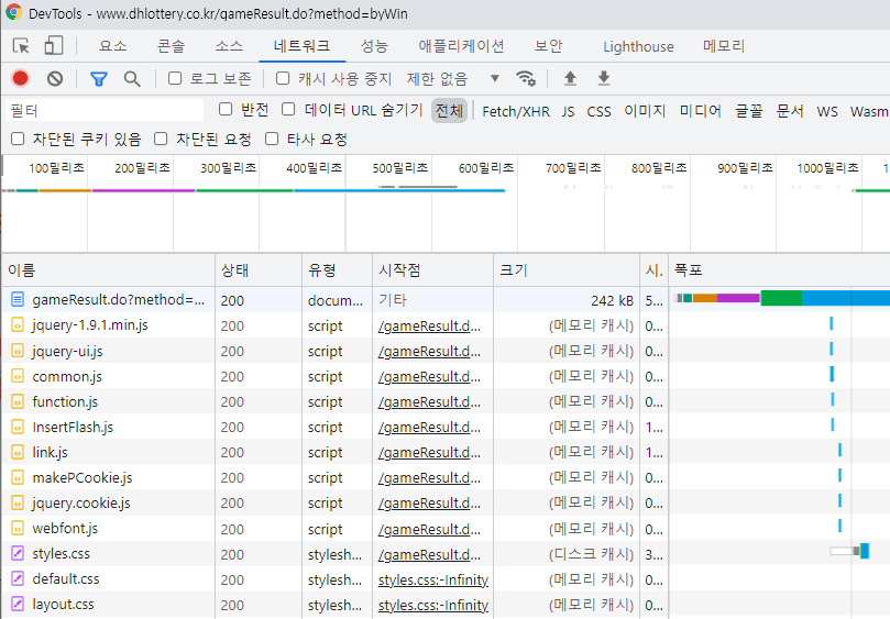 검사 팝업에서 네트워크 탭으로 이동한 뒤 조회버튼을 클릭해주면 위의 2번째 캡처화면과 같이 표현됩니다.