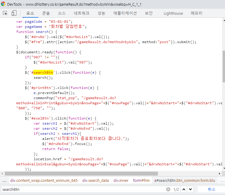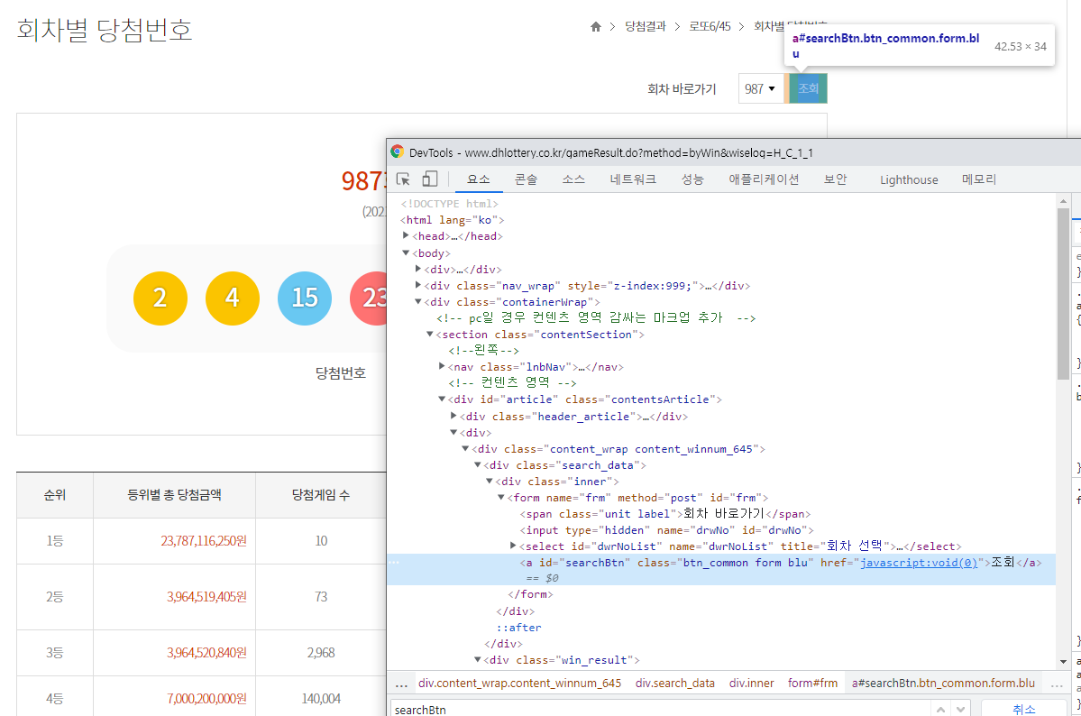 회차를 선택하고 조회버튼을 누르면 해당 회차의 당첨번호를 조회하는 동작을 하므로 조회 버튼에 대한 검사를 진행하였습니다.
