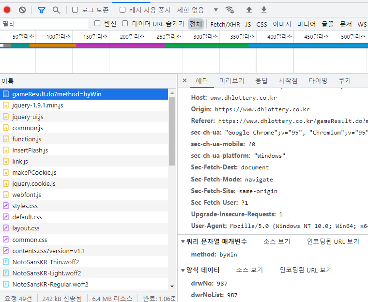 POST에 담기는 데이터로 'dwrNo', 'drwNoList'가 있는 것을 확인하였습니다.