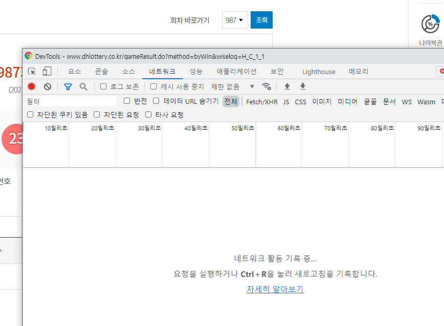 해당 페이지에서 986, 985, ... 등 이전 회차 번호도 확인하기 위한 URL을 파악해보겠습니다.