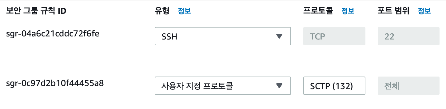 SCTP는 132번이므로 보안그룹의 유형은 '사용자 지정 프로토콜', 프로토콜은 132를 입력하였습니다.
